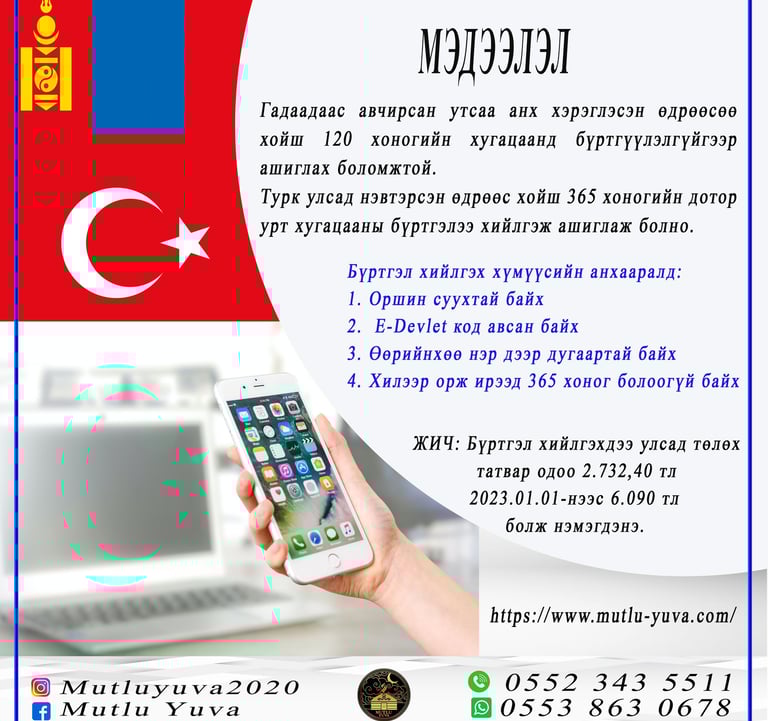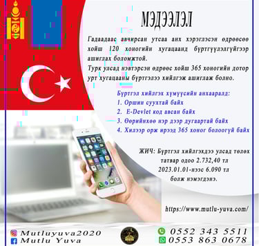 Турк улсад нэвтэрсэн өдрөөс хойш 365 хоногийн дотор урт хугацааны бүртгэлээ хийлгэж ашиглаж болно.